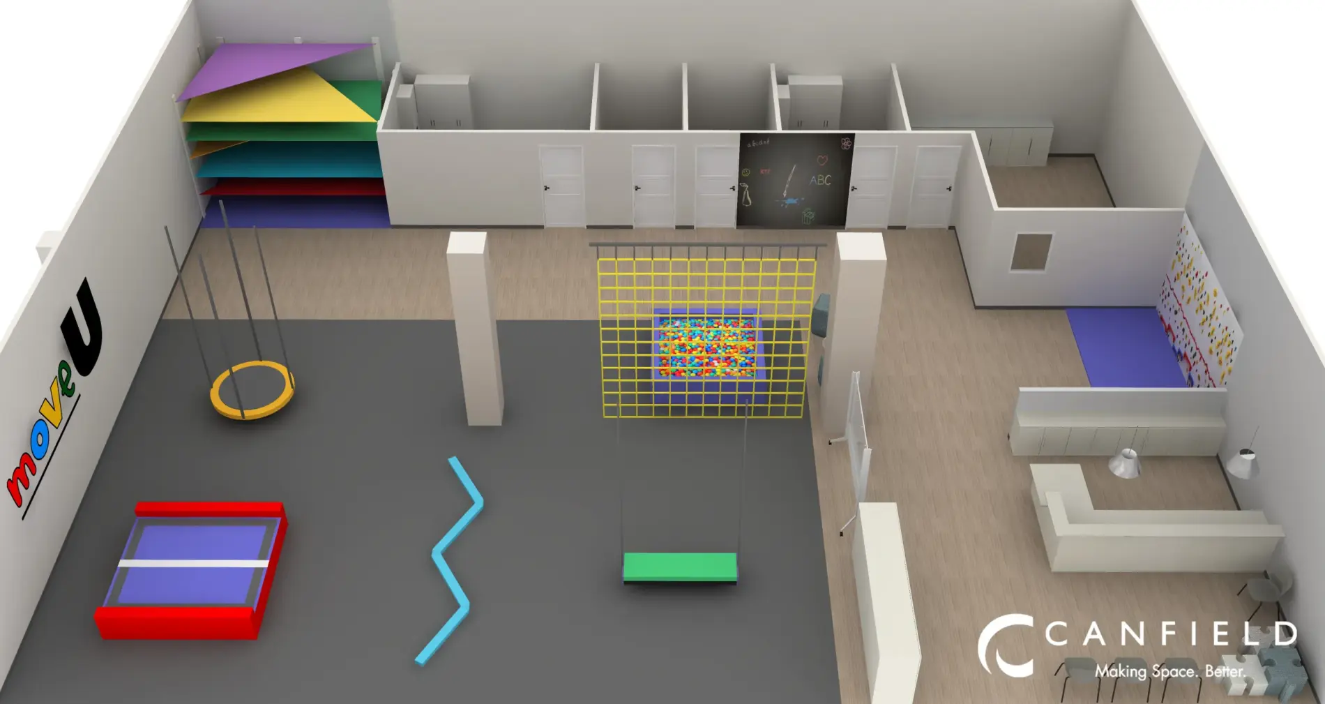 - Suspended Equipment and Swings – A minimum of 3 swing hooks are required to align with the Ayres Sensory Integration Fidelity Measure. Move U’s new headquarters will have 18, yes, 18 swing hooks placed throughout the space! Swings offer a tremendous opportunity to move dynamically and in variation. The use of swings and suspended equipment is an integral part of treatment using a sensory processing and integration framework as the movement. Swings can promote regulation, reduce sensitivity, and improve attention, strength, posture control, coordination of the two sides of the body, visual skills, body awareness as well as motor planning and fluidity of movement.